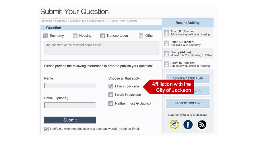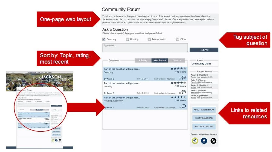 Step two of our solution is to increase citizen engagement outside of public meetings in a way that is cost effective for the city and can be implemented instantly, as the master planning process has already started. To do this, we are integrating a question and answer web page on the Jackson Master Plan website. The forum web page is designed to be simplistic and easy to understand without having much familiarity with online forums. Key features include: