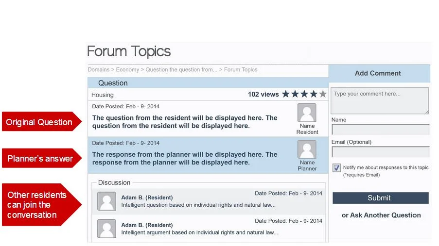 Finally, this is what the web page would look like after the question has been submitted and the planner has answered it. Below the planner’s answer, other residents are able to join in on the conversation, as well as rate the importance or relevance of the question.